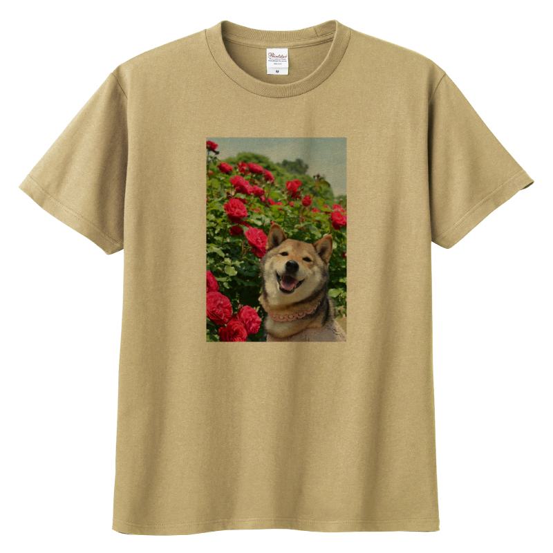 アースカラー。 カーキより少し土色寄りの落ち着いた色。Tシャツ生地の色を受けて、肌の色やペットの白い毛の部分がTシャツ生地の色になります。淡い濃淡の写真だとTシャツの色に負けてしまいすのでコントラストがはっきりとしていて濃いめの写真がおすすめ。カラー印刷よりはモノクロ印刷の方が向いてます。