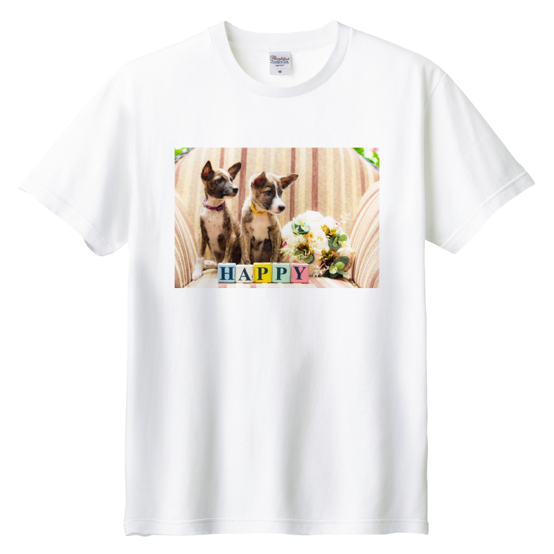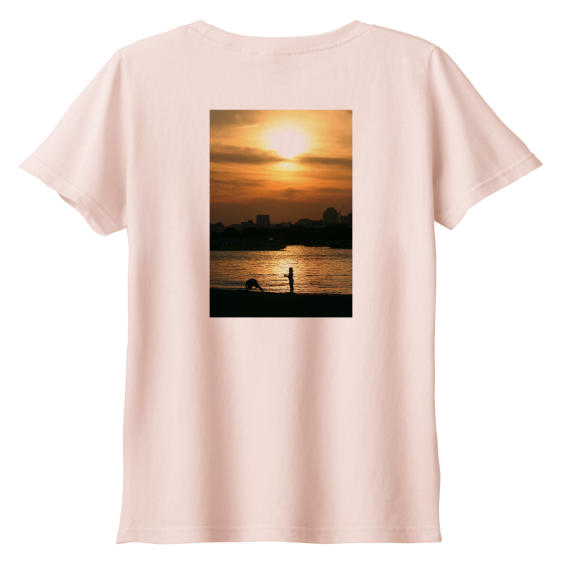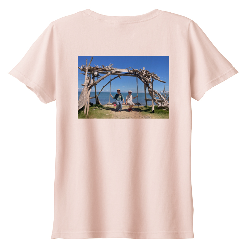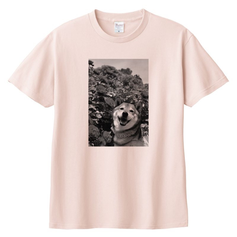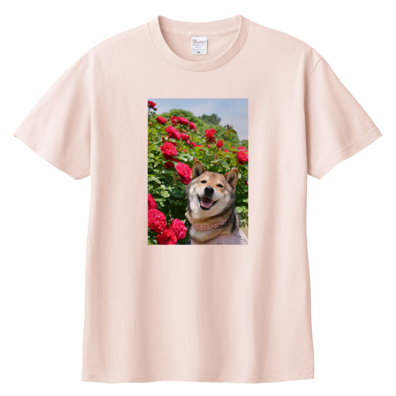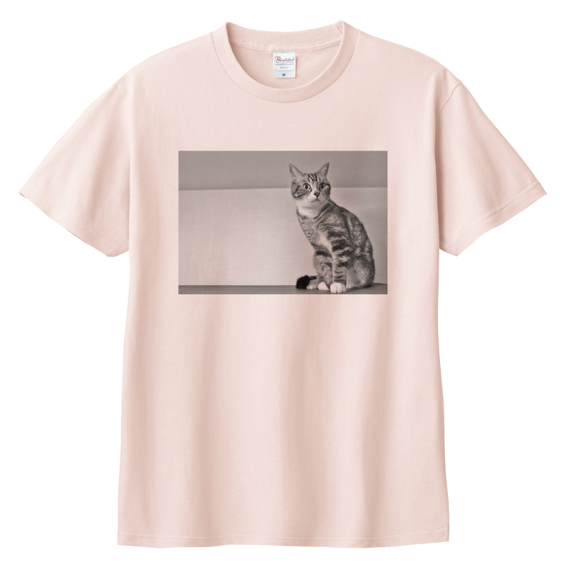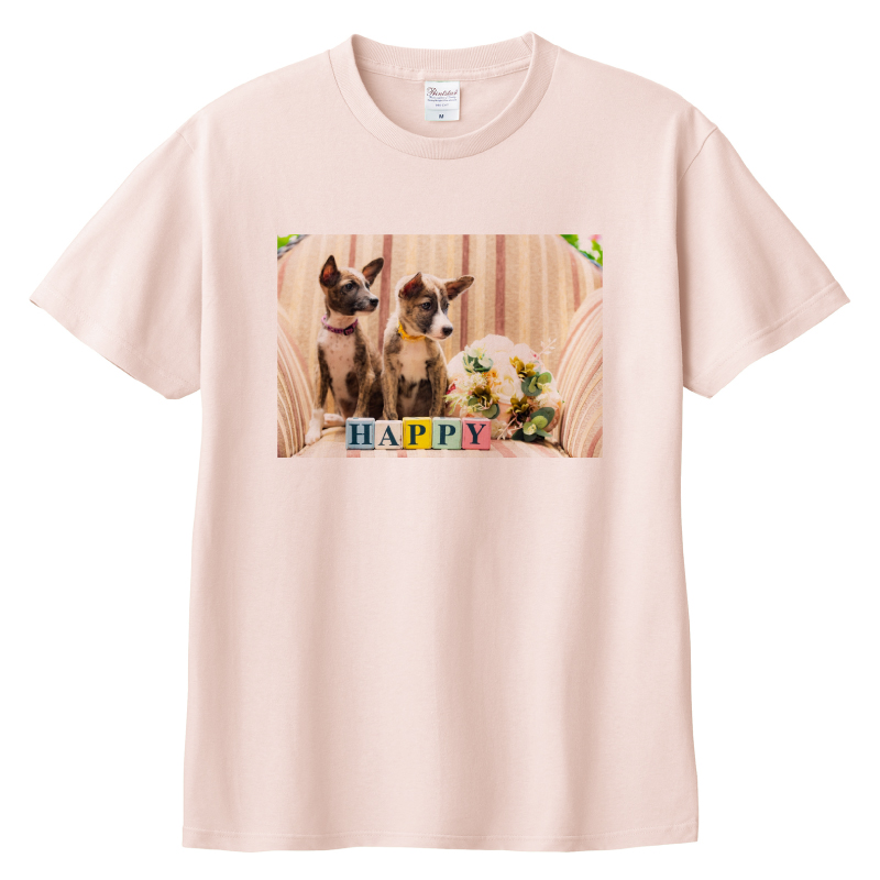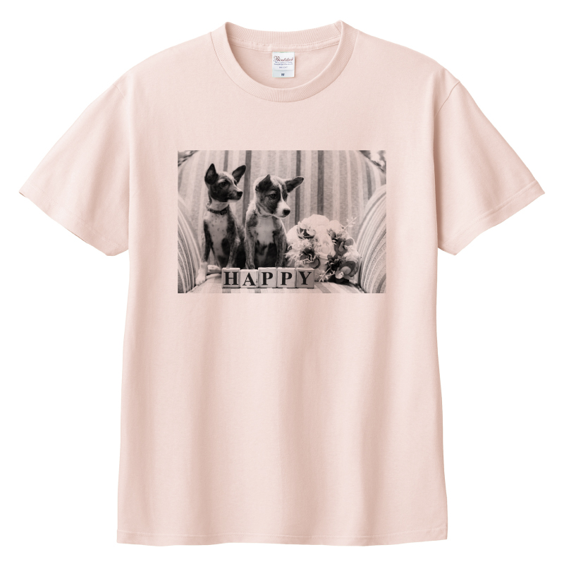 ふんわり淡い、優しい色のライトピンク。Tシャツ生地の色を受けて、肌の色やペットの白い毛の部分がTシャツ生地の色になりますが、淡いピンクなのでほぼ違和感ない仕上がりに。カラー印刷モノクロ印刷どちらもいいですが、カラーの方がかわいい印象。コントラストがはっきりとしていて濃いめの写真がおすすめ。