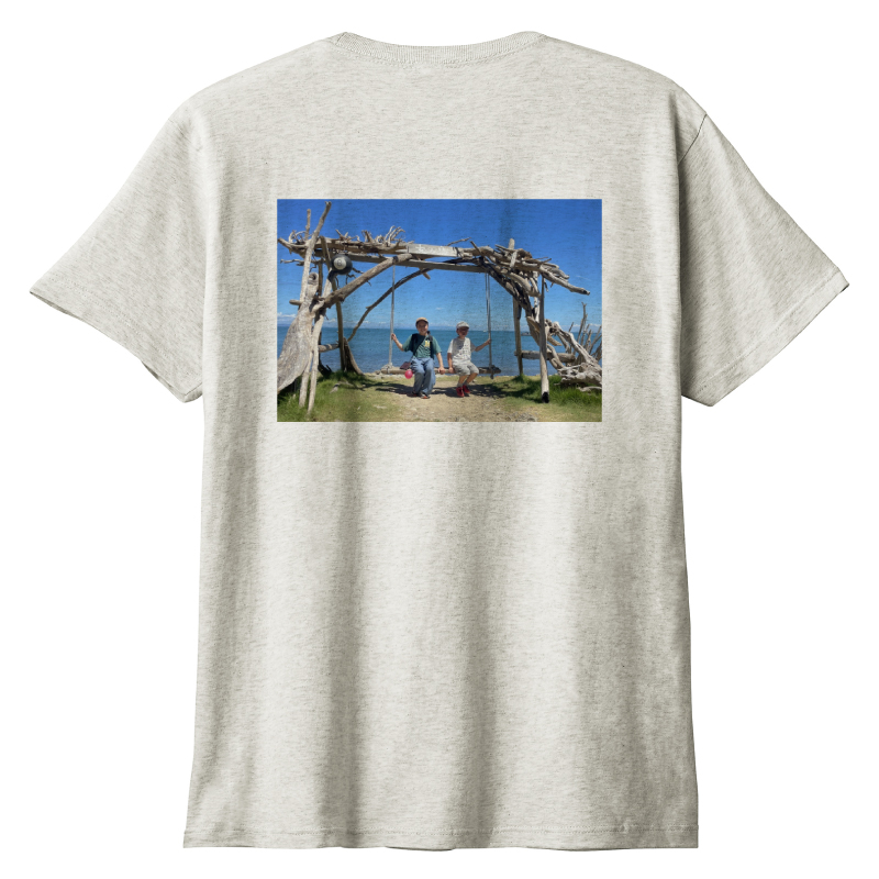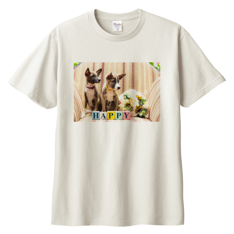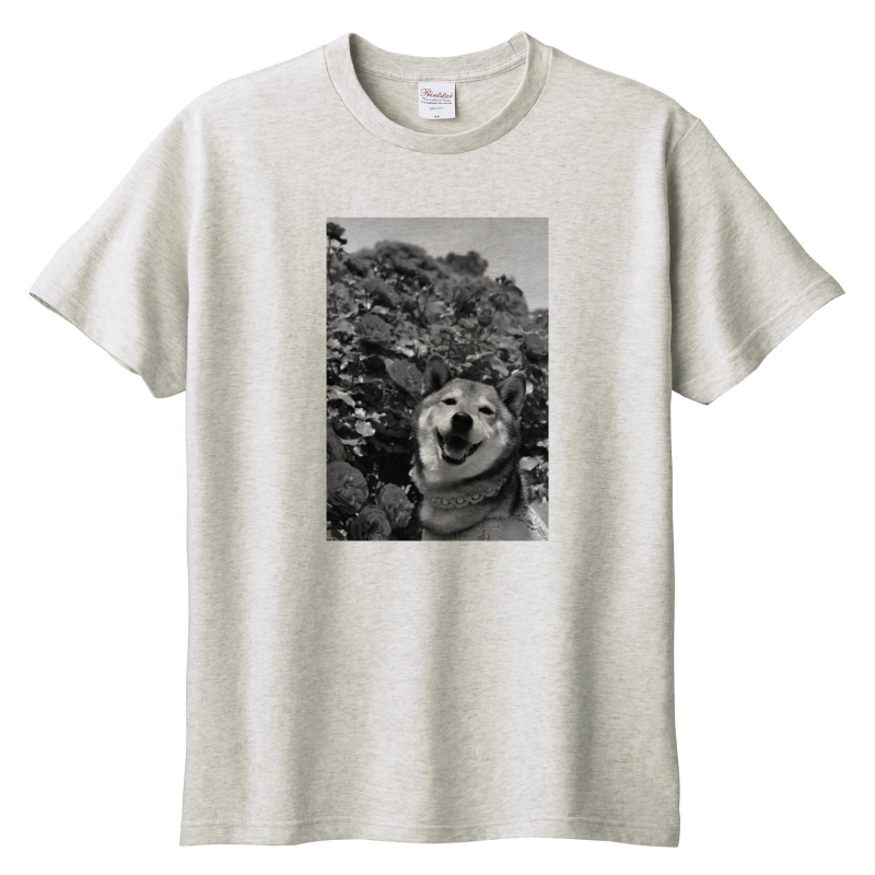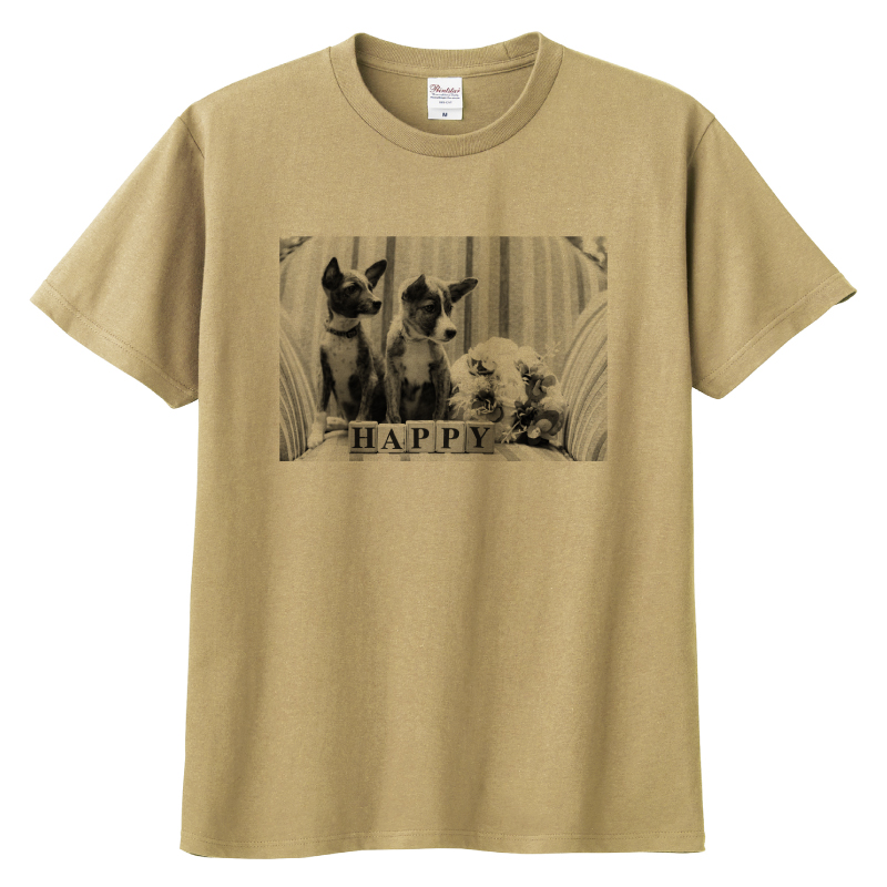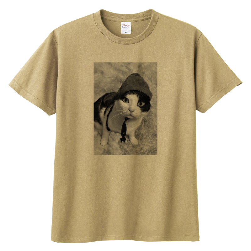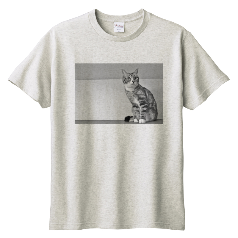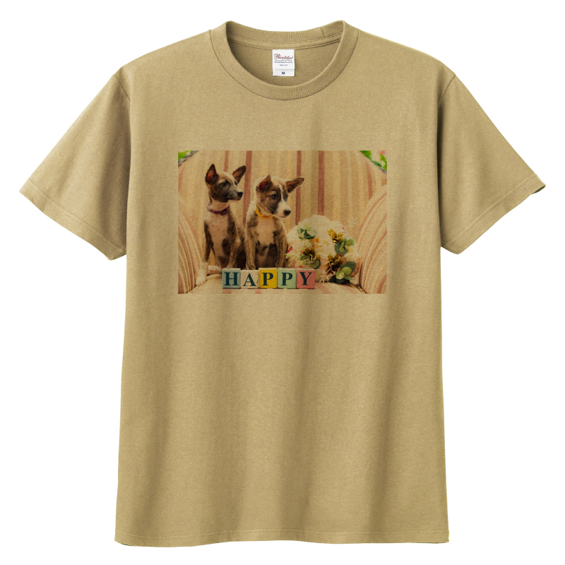 薄いグレーとベージュをミックスしたニュアンスカラーです。Tシャツ生地の色を受けてしまうので(肌の色やペットの白い毛の部分がTシャツ生地の色になります)、カラー印刷よりはモノクロ印刷の方が合います。コントラストがはっきりとしていて濃いめの写真がおすすめ。