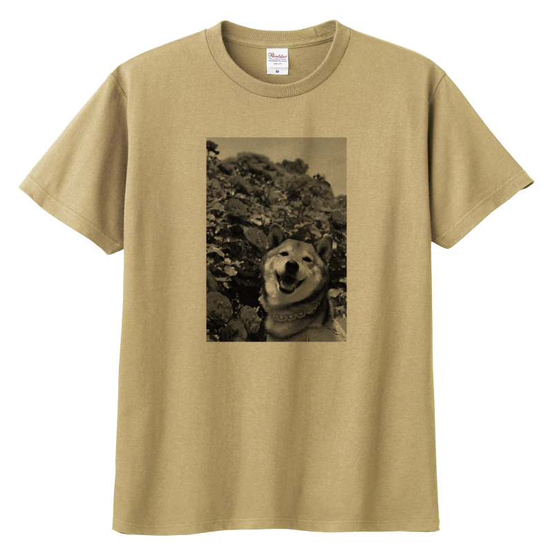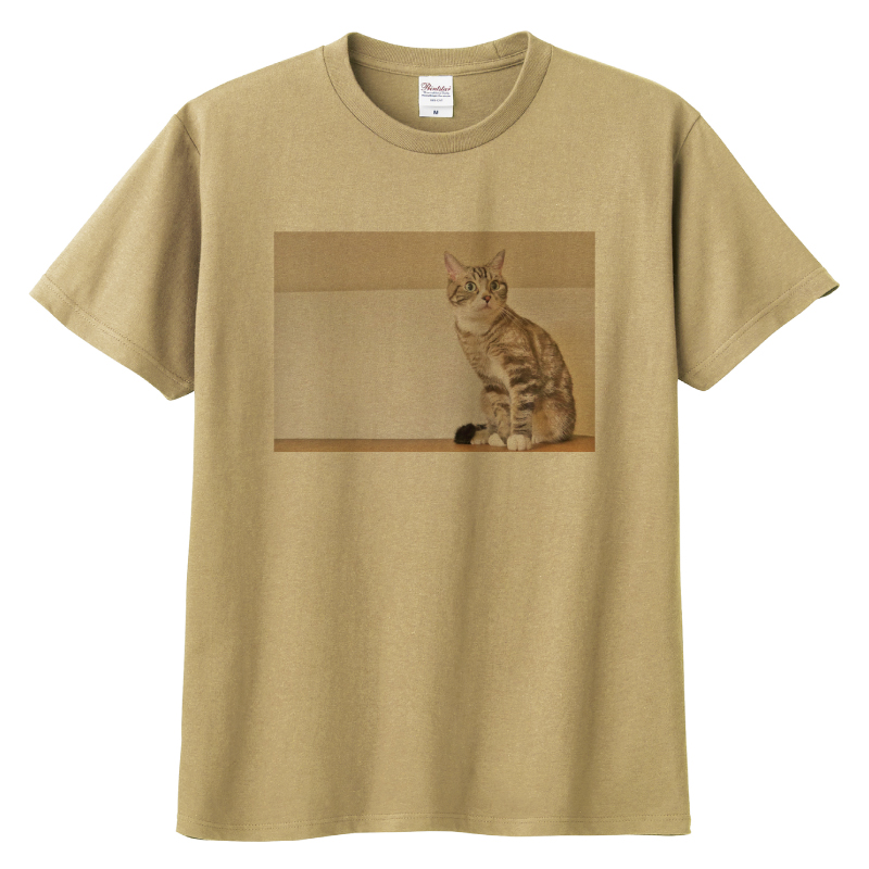 アースカラー。 カーキより少し土色寄りの落ち着いた色。Tシャツ生地の色を受けて、肌の色やペットの白い毛の部分がTシャツ生地の色になります。淡い濃淡の写真だとTシャツの色に負けてしまいすのでコントラストがはっきりとしていて濃いめの写真がおすすめ。カラー印刷よりはモノクロ印刷の方が向いてます。